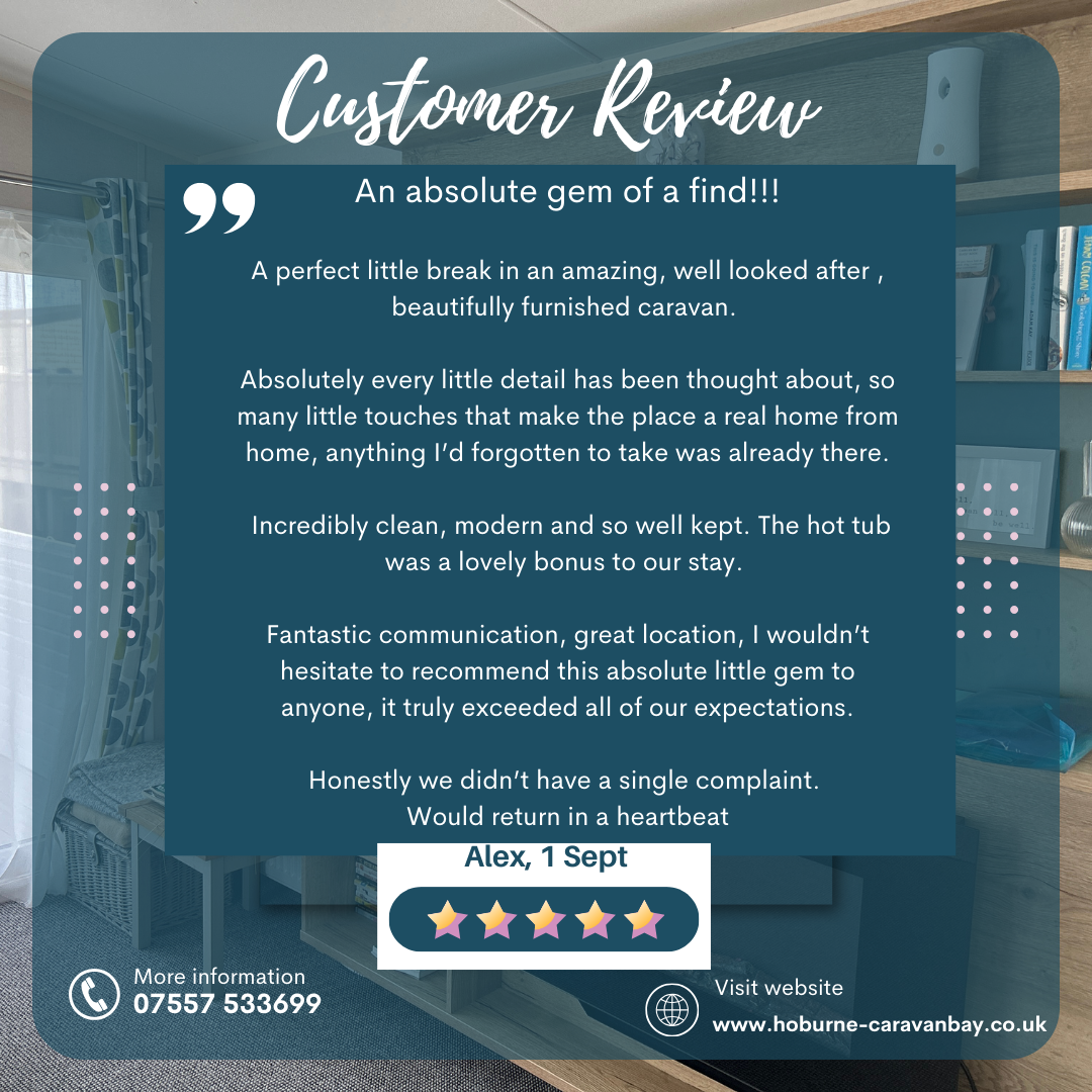 Simply read my reviews.....https://www.hoburne-caravanbay.co.uk/reviews